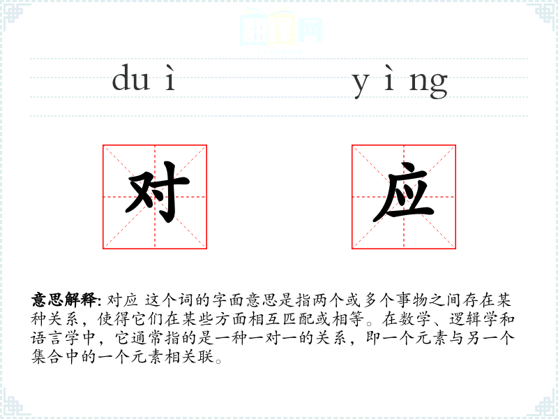 对应 这个词的字面意思是指两个或多个事物之间存在某种关系,使得它们在某些方面相互匹配或相等。在数学、逻辑学和语言学中,它通常指的是一种一对一的关系,即一个元素与另一个集合中的一个元素相关联。