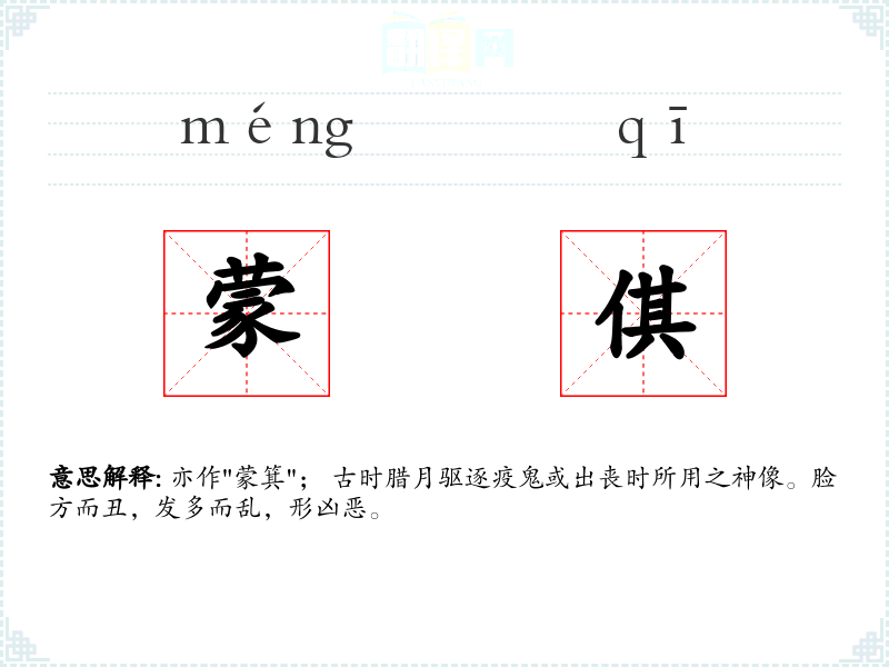 亦作"蒙箕"; 古时腊月驱逐疫鬼或出丧时所用之神像。脸方而丑,发多而乱,形凶恶。