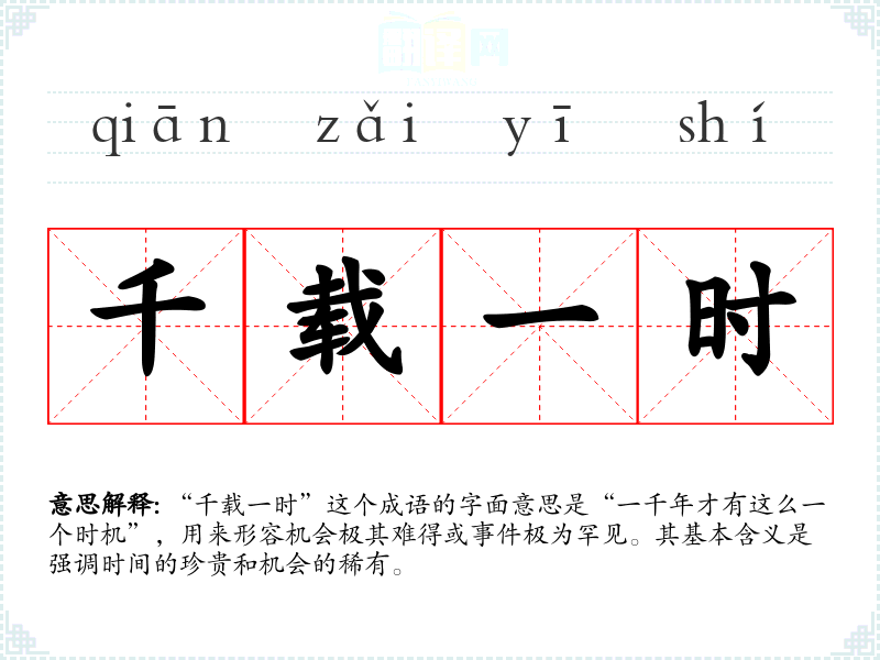 “千载一时”这个成语的字面意思是“一千年才有这么一个时机”,用来形容机会极其难得或**极为罕见。其基本含义是强调时间的珍贵和机会的稀有。