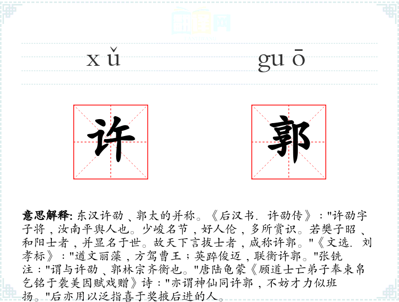 1.东汉许劭﹑郭太的并称。《后汉书.许劭传》﹕"许劭字子将﹐汝南平舆人也。少峻名节﹐好人伦﹐多所赏识。若樊子昭﹑和阳士者﹐并显名于世。故天下言拔士者﹐咸称许郭。"《文选.刘孝标》﹕"遒文丽藻﹐方驾曹王﹔英踤俊迈﹐联衡许郭。"张铣注﹕"谓与许劭﹑郭林宗齐衡也。"唐陆龟蒙《顾道士亡弟子奉束帛乞铭于袭美因赋戏赠》诗﹕"亦谓神仙同许郭﹐不妨才力似班扬。"后亦用以泛指喜于奖掖后进的人。