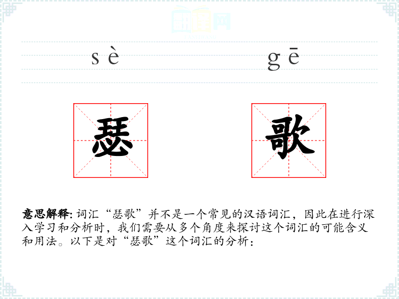 词汇“瑟歌”并不是一个常见的汉语词汇,因此在进行深入学*和分析时,我们需要从多个角度来探讨这个词汇的可能含义和用法。以下是对“瑟歌”这个词汇的分析: