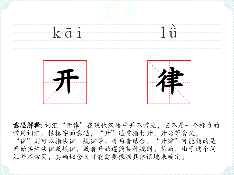 由于“开律”不是一个常用词汇,它在不同语言或文化中的对应词汇可能不太明确。在其他语言中,可能会有类似的表达,但具体词汇会有所不同。