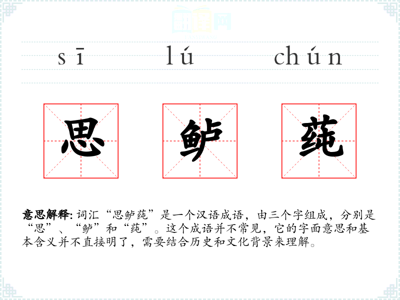 词汇“思鲈莼”是一个汉语成语,由三个字组成,分别是“思”、“鲈”和“莼”。这个成语并不常见,它的字面意思和基本含义并不直接明了,需要结合历史和文化背景来理解。