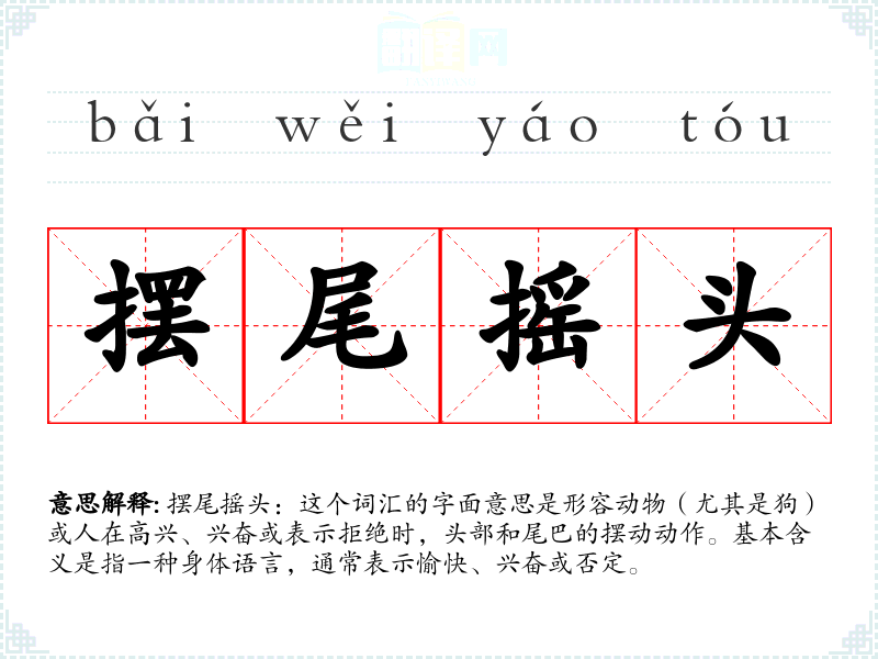 摆尾摇头:这个词汇的字面意思是形容动物(尤其是狗)或人在高兴、兴奋或表示拒绝时,头部和尾巴的摆动动作。基本含义是指一种身体语言,通常表示愉快、兴奋或否定。
