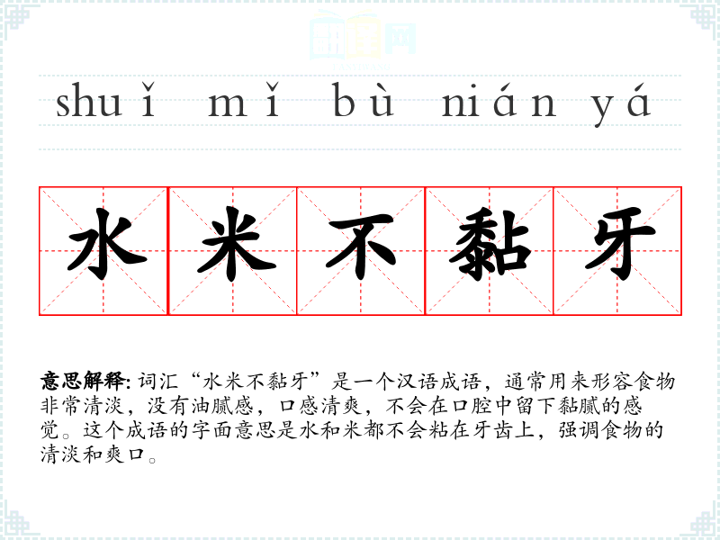 词汇“水米不黏牙”是一个汉语成语,通常用来形容食物非常清淡,没有油腻感,口感清爽,不会在口腔中留下黏腻的感觉。这个成语的字面意思是水和米都不会粘在牙齿上,强调食物的清淡和爽口。