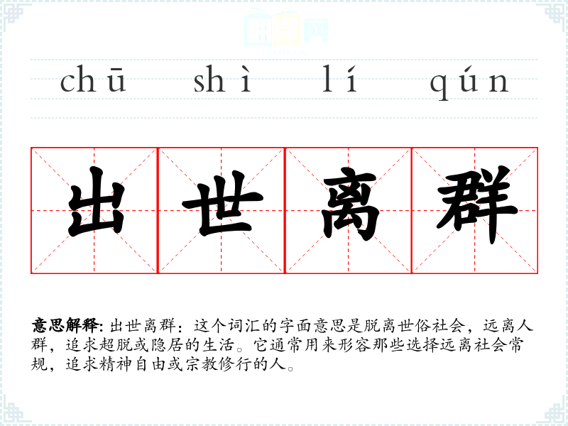 出世离群:这个词汇的字面意思是脱离世俗社会,远离人群,追求超脱或隐居的生活。它通常用来形容那些选择远离社会常规,追求精神自由或**修行的人。