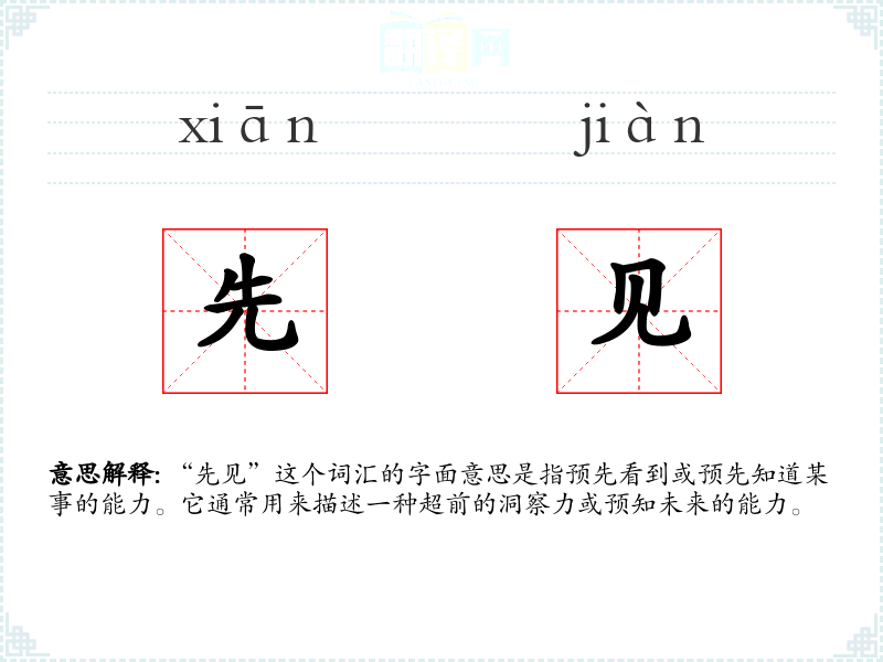 “先见”这个词汇的字面意思是指预先看到或预先知道某事的能力。它通常用来描述一种超前的洞察力或预知未来的能力。
