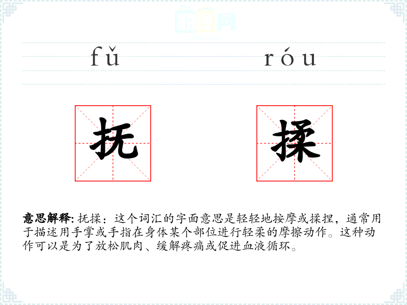 抚揉:这个词汇的字面意思是轻轻地按摩或揉捏,通常用于描述用手掌或手指在身体某个部位进行轻柔的摩擦动作。这种动作可以是为了放松肌肉、缓解疼痛或促进血液循环。