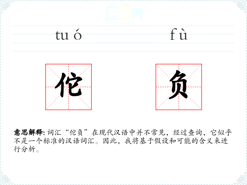 词汇“佗负”在现代汉语中并不常见,经过查询,它似乎不是一个标准的汉语词汇。因此,我将基于假设和可能的含义来进行分析。