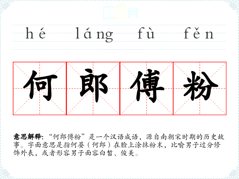 “何郎傅粉”源自南朝宋时期,何晏是当时的名士,因其面容白皙,常被人形容为“傅粉”。随着时间的推移,这个成语逐渐被用来形容男子的美貌或过分修饰外表。