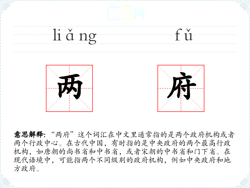 “两府”这个词汇对于理解*古代政治和行政体系非常重要,它不仅是一个历史学术语,也是一个能够引发丰富联想和讨论的词汇。在我的语言学和表达中,理解和正确使用这个词汇能够增强我的历史知识和文化素养。