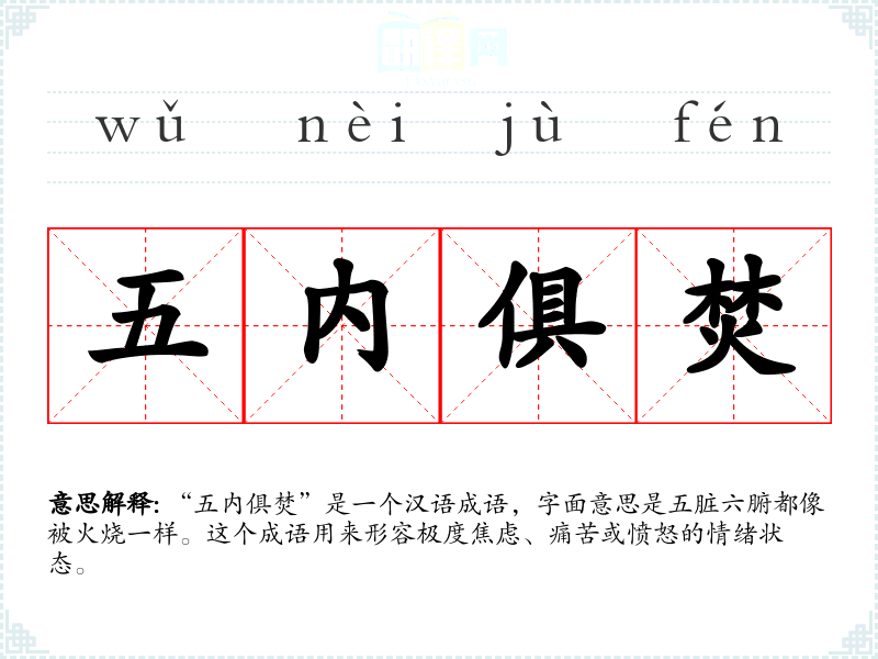 “五内俱焚”是一个汉语成语,字面意思是五脏六腑都像被火烧一样。这个成语用来形容极度焦虑、痛苦或愤怒的情绪状态。