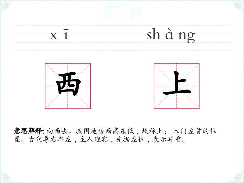 向西去。我国地势西高东低﹐故称上; 入门左首的位置。古代尊右卑左﹐主人迎宾﹐先据左位﹐表示尊重。