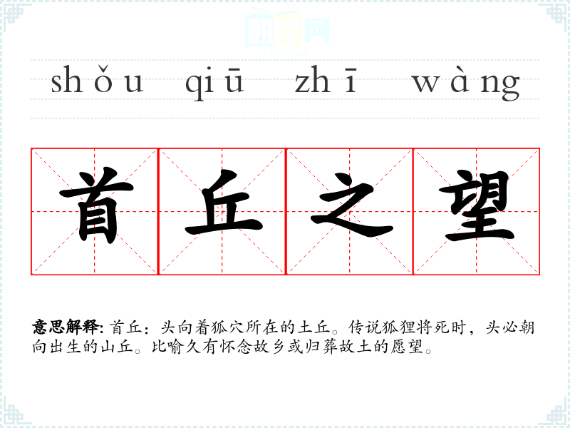 首丘:头向着狐穴所在的土丘。传说狐狸将死时,头必朝向出生的山丘。比喻久有怀念故乡或归葬故土的愿望。