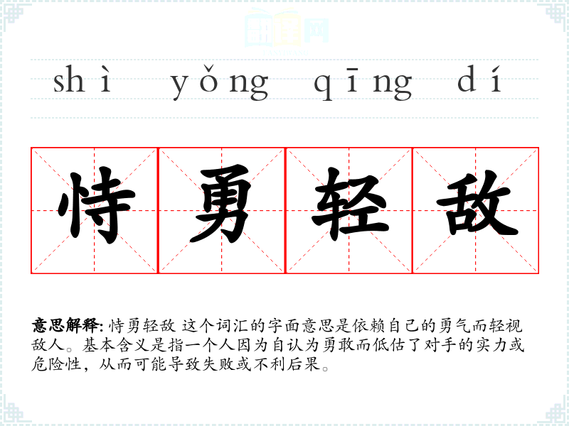 恃勇轻敌 这个词汇的字面意思是依赖自己的勇气而轻视敌人。基本含义是指一个人因为自认为勇敢而低估了对手的实力或危险性,从而可能导致失败或不利后果。