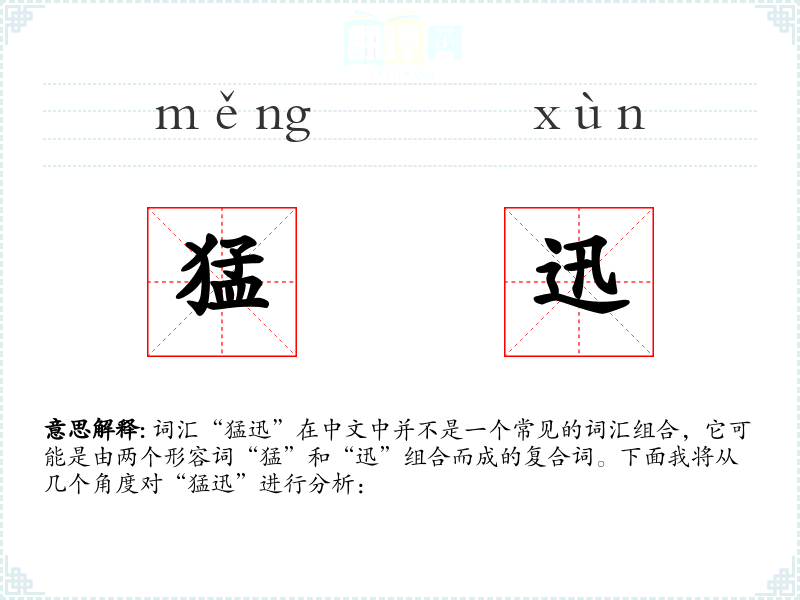 词汇“猛迅”在中文中并不是一个常见的词汇组合,它可能是由两个形容词“猛”和“迅”组合而成的复合词。下面我将从几个角度对“猛迅”进行分析: