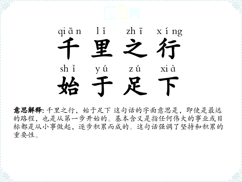 千里之行,始于足下 这句话的字面意思是,即使是最远的路程,也是从第一步开始的。基本含义是指任何伟大的事业或目标都是从小事做起,逐步积累而成的。这句话强调了坚持和积累的重要性。