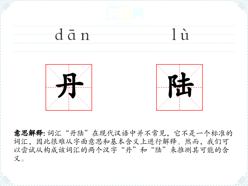 词汇“丹陆”在现代汉语中并不常见,它不是一个标准的词汇,因此很难从字面意思和基本含义上进行解释。然而,我们可以尝试从构成该词汇的两个汉字“丹”和“陆”来推测其可能的含义。