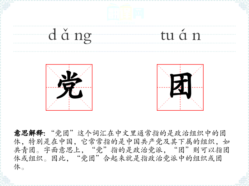 “党团”这个词汇在中文里通常指的是政治组织中的团体,特别是在,它常常指的是共产党及其下属的组织,如共青团。字面意思上,“党”指的是政治党派,“团”则可以指团体或组织。因此,“党团”合起来就是指政治党派中的组织或团体。