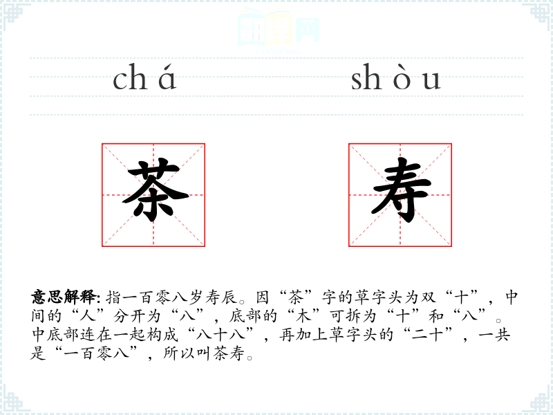 指一百零八岁寿辰。因“茶”字的草字头为双“十”,中间的“人”分开为“八”,底部的“木”可拆为“十”和“八”。中底部连在一起构成“八十八”,再加上草字头的“二十”,一共是“一百零八”,所以叫茶寿。