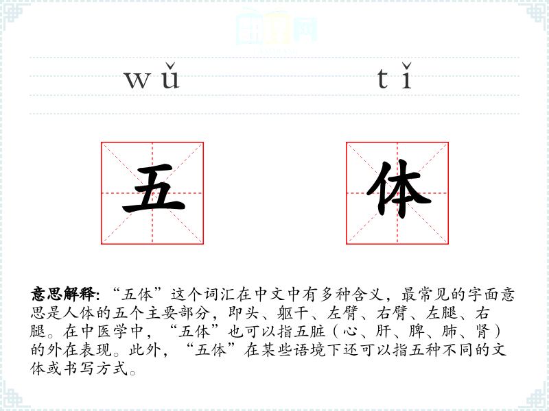 “五体”这个词汇在中文中有多种含义,最常见的字面意思是人体的五个主要部分,即头、躯干、左臂、右臂、左腿、右腿。在中医学中,“五体”也可以指五脏(心、肝、脾、肺、肾)的外在表现。此外,“五体”在某些语境下还可以指五种不同的文体或书写方式。