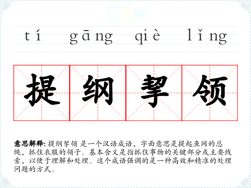 提纲挈领 是一个汉语成语,字面意思是提起鱼网的总绳,抓住衣服的领子。基本含义是指抓住事物的关键部分或主要线索,以便于理解和处理。这个成语强调的是一种高效和精准的处理问题的方式。