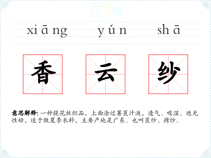 一种提花丝织品,上面涂过薯莨汁液,透气、吸湿、遮光性好,适于做夏季衣料,主要产地是广东。也叫莨纱、拷纱。