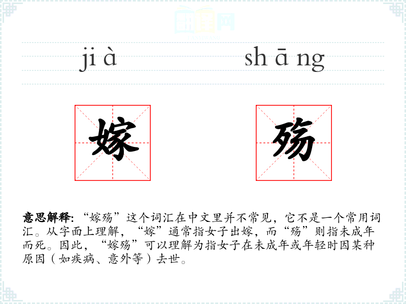 “嫁殇”这个词汇在中文里并不常见,它不是一个常用词汇。从字面上理解,“嫁”通常指女子出嫁,而“殇”则指未成年而死。因此,“嫁殇”可以理解为指女子在未成年或年轻时因某种原因(如疾病、意外等)去世。