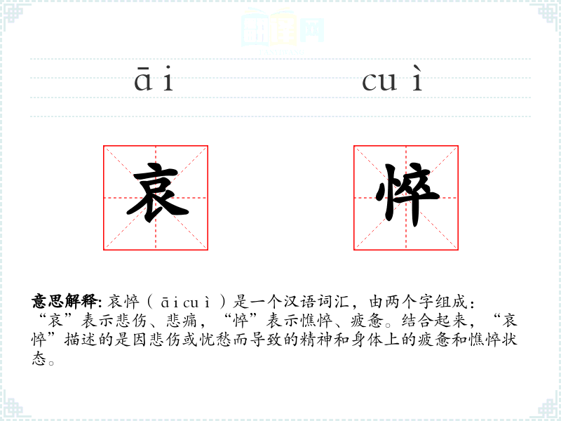哀悴(āi cuì)是一个汉语词汇,由两个字组成:“哀”表示悲伤、悲痛,“悴”表示憔悴、疲惫。结合起来,“哀悴”描述的是因悲伤或忧愁而导致的精神和身体上的疲惫和憔悴状态。