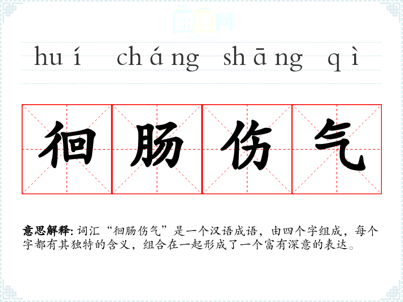 词汇“徊肠伤气”是一个汉语成语,由四个字组成,每个字都有其独特的含义,组合在一起形成了一个富有深意的表达。