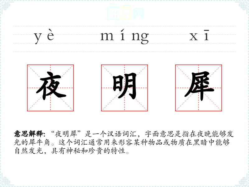 - 同义词:夜明珠、荧光石(这些词汇都指在黑暗中发光的物品,但“夜明犀”更侧重于神秘和珍贵的特性)