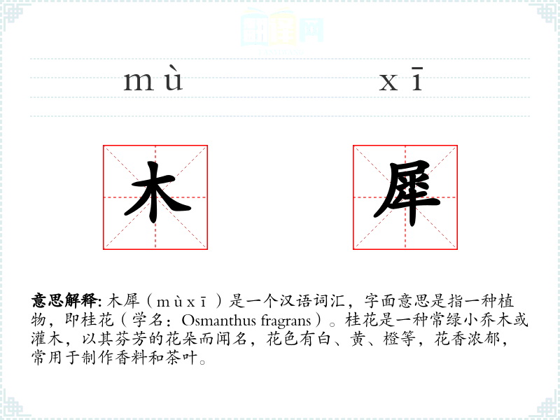 木犀(mùxī)是一个汉语词汇,字面意思是指一种植物,即桂花(学名:Osmanthus fragrans)。桂花是一种常绿小乔木或灌木,以其芬芳的花朵而闻名,花色有白、黄、橙等,花香浓郁,常用于制作香料和茶叶。