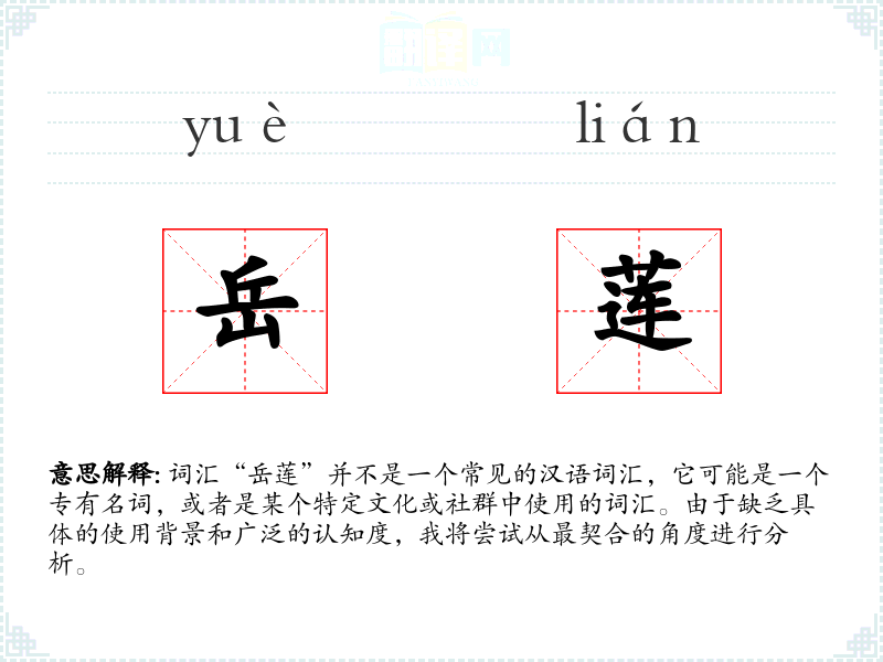 词汇“岳莲”并不是一个常见的汉语词汇,它可能是一个专有名词,或者是某个特定文化或社群中使用的词汇。由于缺乏具体的使用背景和广泛的认知度,我将尝试从最契合的角度进行分析。