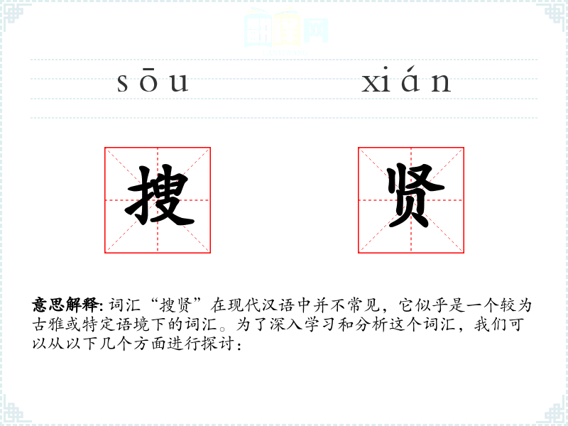 词汇“搜贤”在现代汉语中并不常见,它似乎是一个较为古雅或特定语境下的词汇。为了深入学*和分析这个词汇,我们可以从以下几个方面进行探讨: