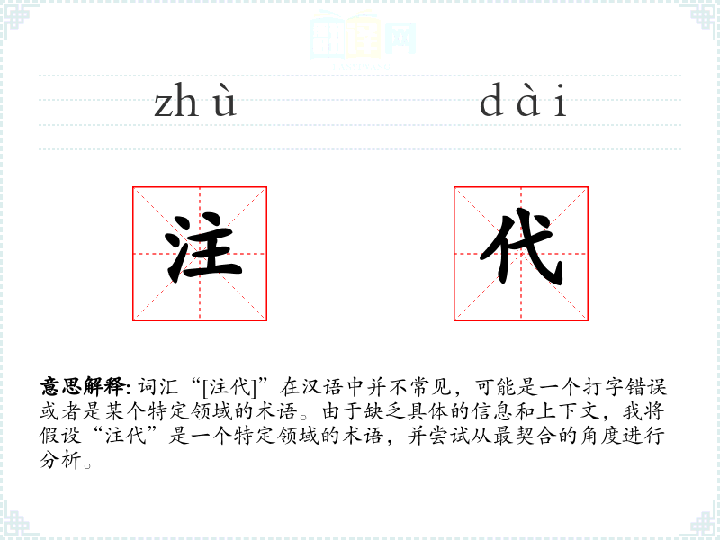 由于“注代”不是一个标准汉语词汇,对其的理解和应用存在很大的不确定性。在语言学习和表达中,了解词汇的确切含义和使用场景是非常重要的。如果“注代”是一个特定领域的术语,那么在其专业领域内理解和正确使用它将是非常关键的。
