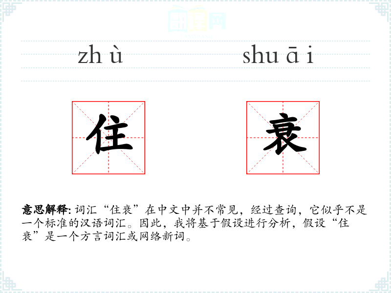 词汇“住衰”在中文中并不常见,经过查询,它似乎不是一个标准的汉语词汇。因此,我将基于假设进行分析,假设“住衰”是一个方言词汇或网络新词。