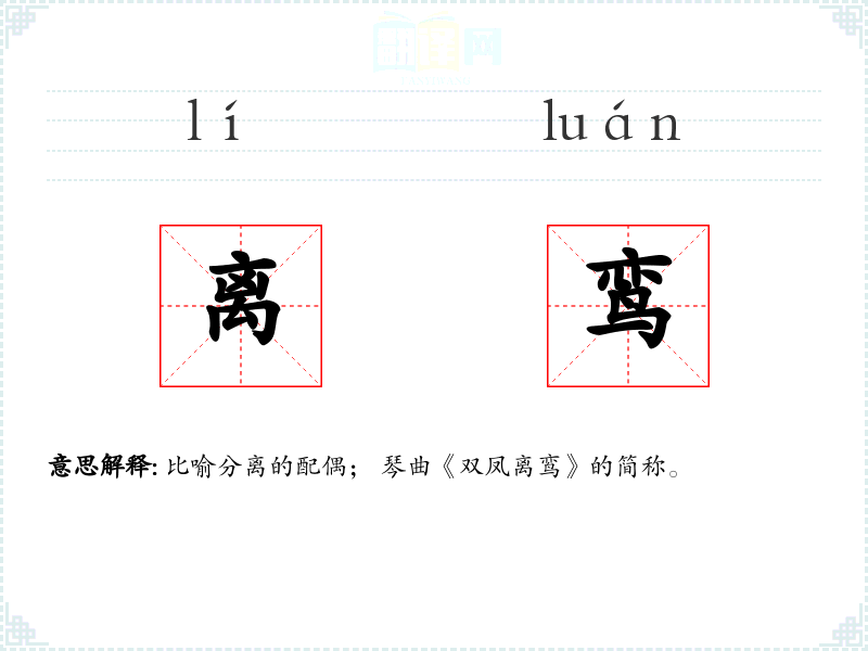 比喻分离的配偶; 琴曲《双凤离鸾》的简称。
