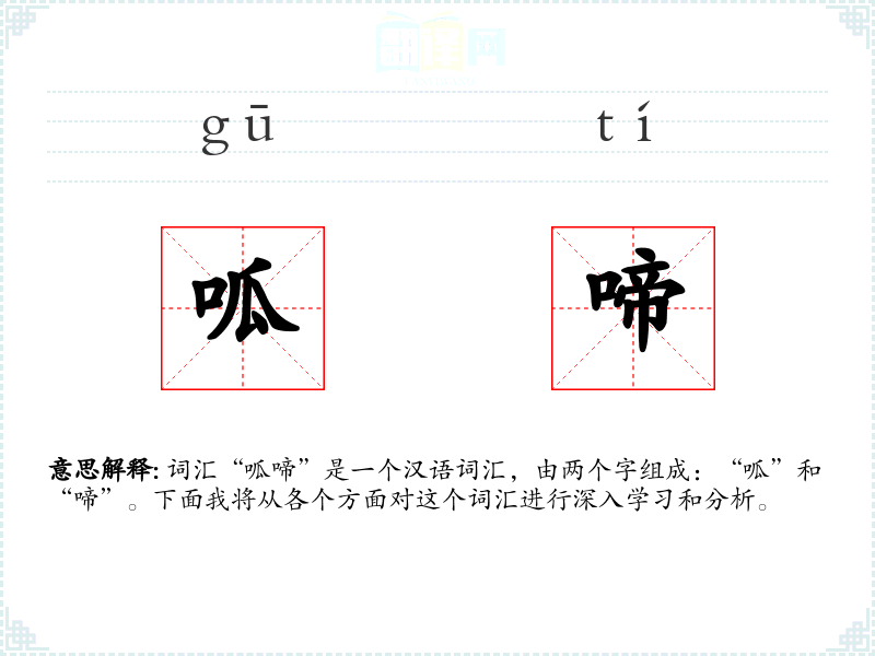 词汇“呱啼”是一个汉语词汇,由两个字组成:“呱”和“啼”。下面我将从各个方面对这个词汇进行深入学*和分析。