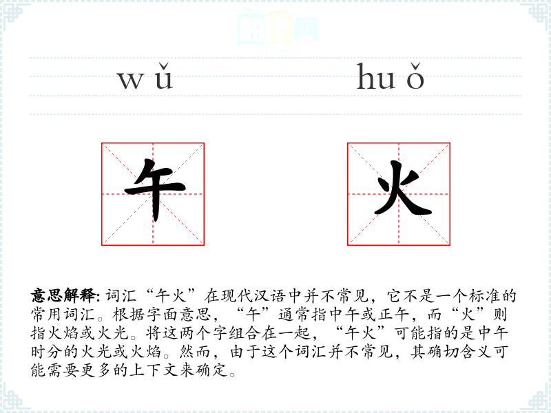 - 反义词:(由于“午火”不是一个常用词汇,反义词不明确)