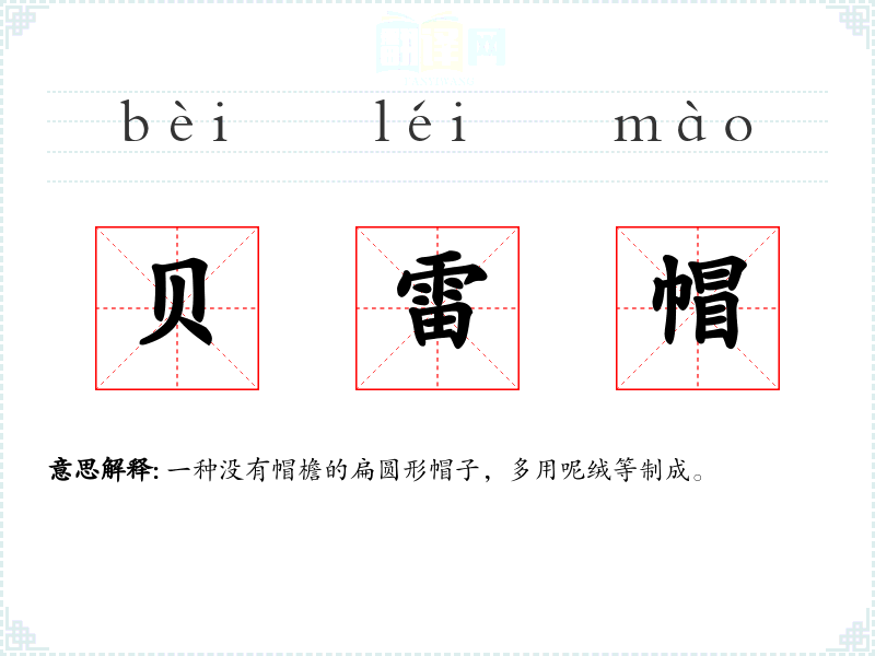 一种没有帽檐的扁圆形帽子,多用呢绒等制成。