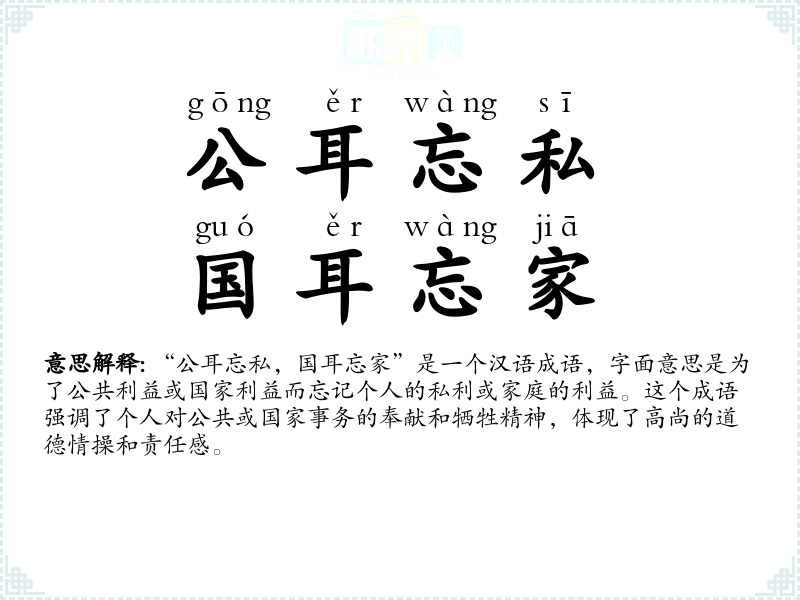 “公耳忘私,国耳忘家”是一个汉语成语,字面意思是为了公共利益或国家利益而忘记个人的私利或家庭的利益。这个成语强调了个人对公共或国家事务的奉献和牺牲精神,体现了高尚的道德情操和责任感。