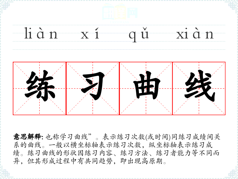 1.也称学习曲线”。表示练习次数(或时间)同练习成绩间关系的曲线。一般以横坐标轴表示练习次数,纵坐标轴表示练习成绩。练习曲线的形状因练习内容、练习方法、练习者能力等不同而异,但其形成过程中有共同趋势,即出现高原期。