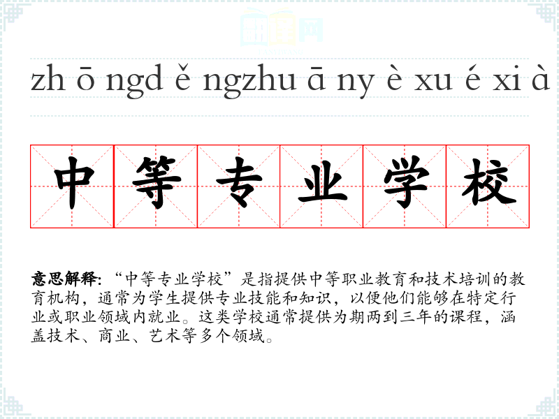 “中等专业学校”是指提供中等职业教育和技术培训的教育机构,通常为学生提供专业技能和知识,以便他们能够在特定行业或职业领域内就业。这类学校通常提供为期两到三年的课程,涵盖技术、商业、艺术等多个领域。