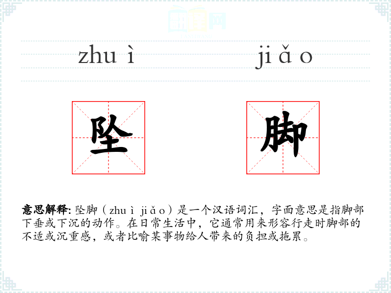 “坠脚”一词的词源较为直接,由“坠”(下垂)和“脚”(脚部)组成。在古代汉语中,“坠”常用来形容物体的下垂,而“脚”则是人体的一部分。随着语言的发展,“坠脚”逐渐被用来形容脚部的不适或沉重感。