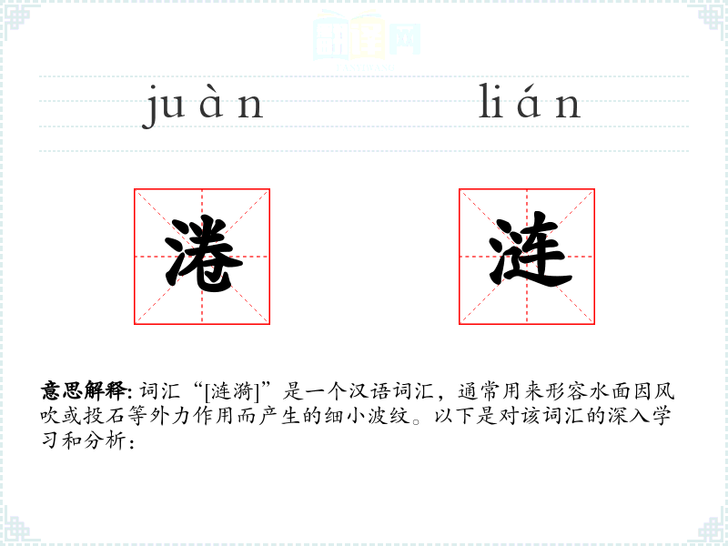 - 词源:涟漪一词源于古代汉语,其字面意思即为水面上细小的波纹。