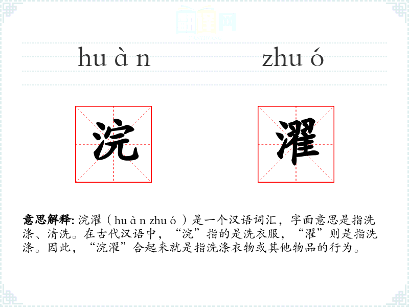浣濯(huàn zhuó)是一个汉语词汇,字面意思是指洗涤、清洗。在古代汉语中,“浣”指的是洗衣服,“濯”则是指洗涤。因此,“浣濯”合起来就是指洗涤衣物或其他物品的行为。