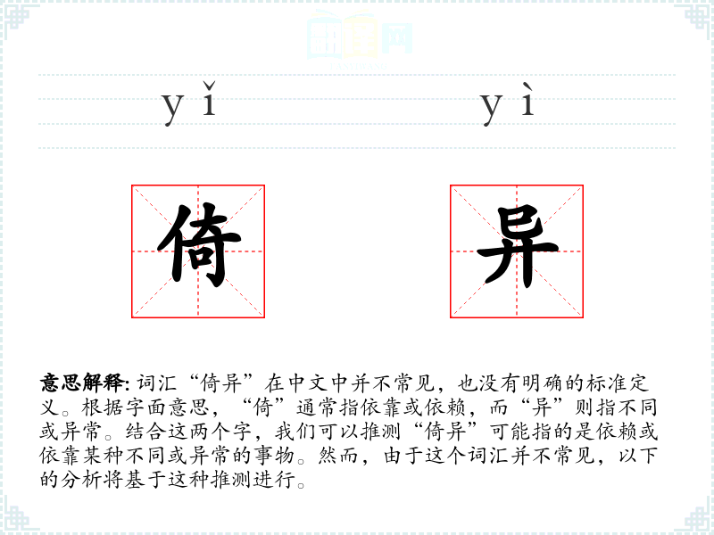 词汇“倚异”在中文中并不常见,也没有明确的标准定义。根据字面意思,“倚”通常指依靠或依赖,而“异”则指不同或异常。结合这两个字,我们可以推测“倚异”可能指的是依赖或依靠某种不同或异常的事物。然而,由于这个词汇并不常见,以下的分析将基于这种推测进行。
