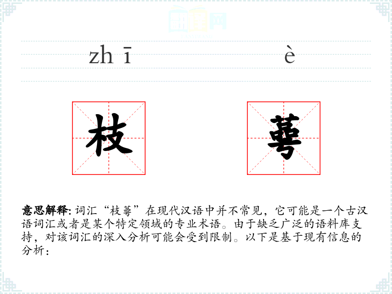 词汇“枝蕚”在现代汉语中并不常见,它可能是一个古汉语词汇或者是某个特定领域的专业术语。由于缺乏广泛的语料库支持,对该词汇的深入分析可能会受到限制。以下是基于现有信息的分析: