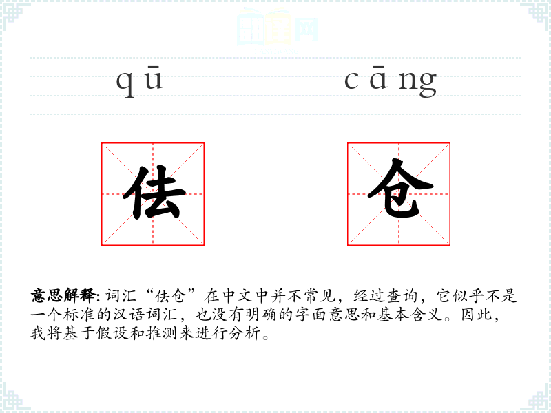 由于“佉仓”不是一个标准汉语词汇,我们无法提供确切的基本定义。它可能是某个方言词汇、特定行业的术语,或者是某个特定文化背景下的词汇。