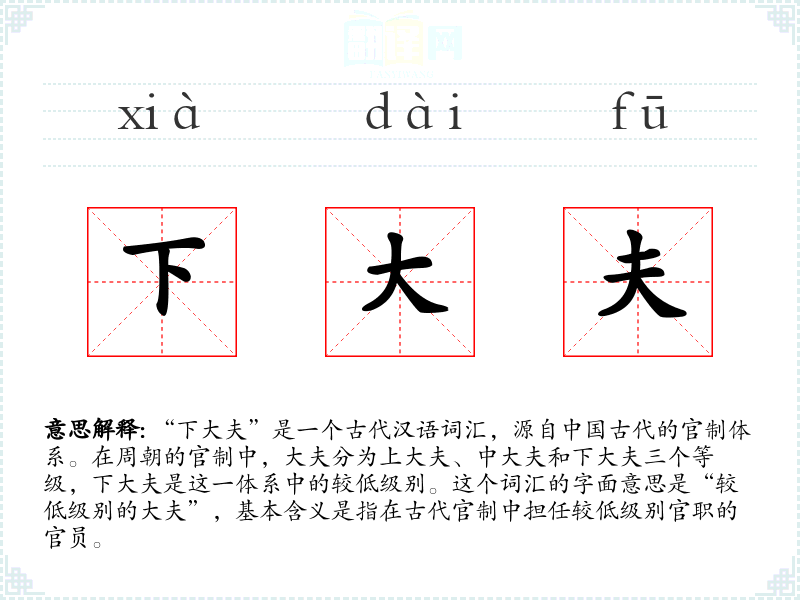 “下大夫”是一个古代汉语词汇,源自**古代的官制体系。在周朝的官制中,大夫分为上大夫、中大夫和下大夫三个等级,下大夫是这一体系中的较低级别。这个词汇的字面意思是“较低级别的大夫”,基本含义是指在古代官制中担任较低级别官职的官员。
